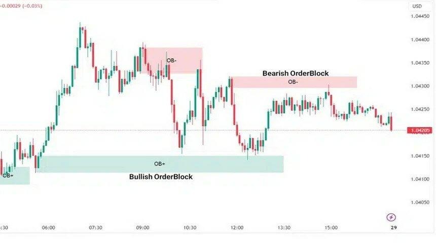 An Order Block (OB) is a price zone where institutional buying or selling occurred before a significant move. These areas represent unfilled or partially filled large orders.